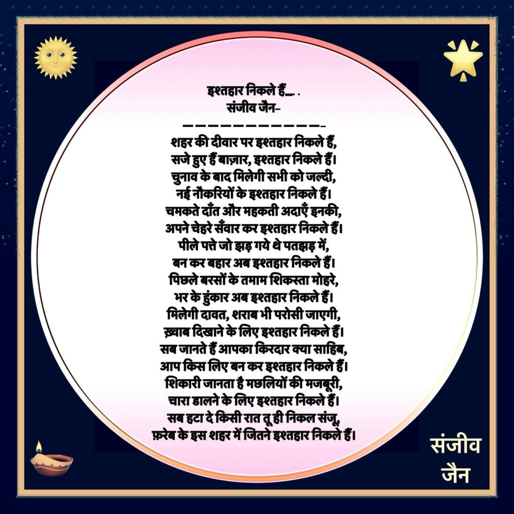 चुनावी मौसम आते ही देश के शहरी और ग्रामीण परिदृश्य में एक विशेष प्रकार की हलचल दिखाई देने लगती है। सड़कों के किनारे, दीवारों पर, चौराहों पर, समाचार पत्रों, डिजिटल प्लेटफॉर्म और सोशल मीडिया तक—हर ओर संदेशों की बाढ़ सी आ जाती है। ये संदेश केवल सूचनाएं नहीं होते, बल्कि वादों, उम्मीदों, सपनों और आकांक्षाओं का ऐसा संसार रचते हैं, जो आम नागरिक को भविष्य के सुनहरे चित्र दिखाते हैं। इसी सामाजिक-राजनीतिक यथार्थ को साहित्यकार संजीव जैन ने अपनी कविता “इश्तहार निकले हैं” में प्रतीकात्मक और व्यंग्यात्मक शैली में अभिव्यक्त किया है।