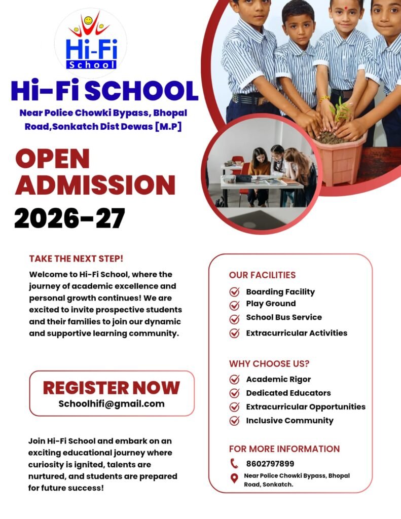 सोनकच्छ (देवास), मध्यप्रदेश। क्षेत्र के प्रतिष्ठित शिक्षण संस्थान Hi-Fi School द्वारा शैक्षणिक सत्र 2026–27 के लिए प्रवेश प्रक्रिया प्रारंभ कर दी गई है। भोपाल रोड स्थित पुलिस चौकी बायपास के समीप संचालित यह विद्यालय विद्यार्थियों के सर्वांगीण विकास एवं गुणवत्तापूर्ण शिक्षा के लिए जाना जाता है।