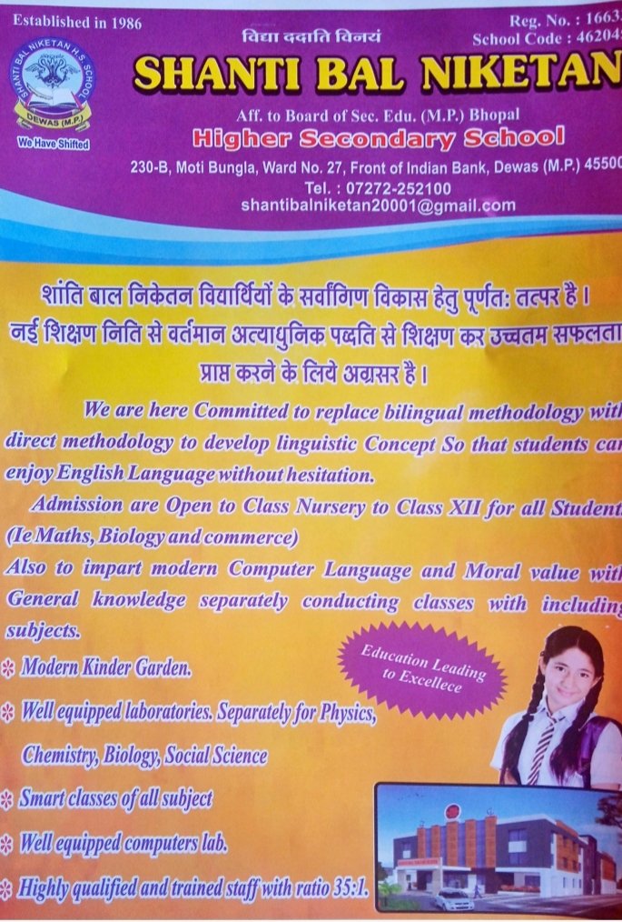 देवास। मध्यप्रदेश के औद्योगिक और शैक्षणिक रूप से उभरते शहर देवास में स्थित शांति बाल निकेतन हायर सेकेंडरी स्कूल ने वर्ष 1986 से लेकर आज तक शिक्षा के क्षेत्र में अपनी विशिष्ट पहचान बनाई है। माध्यमिक शिक्षा मंडल, मध्यप्रदेश, भोपाल से संबद्ध यह विद्यालय न केवल शैक्षणिक उत्कृष्टता के लिए जाना जाता है, बल्कि विद्यार्थियों के सर्वांगीण विकास के लिए भी प्रतिबद्ध है।