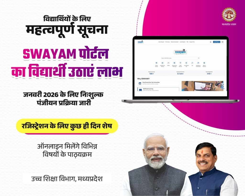 भोपाल। देशभर के विद्यार्थियों के लिए उच्च गुणवत्ता वाली शिक्षा तक सहज और निःशुल्क पहुँच सुनिश्चित करने के उद्देश्य से भारत सरकार द्वारा संचालित ऑनलाइन शिक्षा मंच SWAYAM (Study Webs of Active–Learning for Young Aspiring Minds) पर जनवरी 2026 सत्र के लिए पंजीयन प्रक्रिया प्रारंभ हो चुकी है। इच्छुक विद्यार्थी SWAYAM की आधिकारिक वेबसाइट https://swayam.gov.in पर जाकर ऑनलाइन पंजीयन कर सकते हैं।