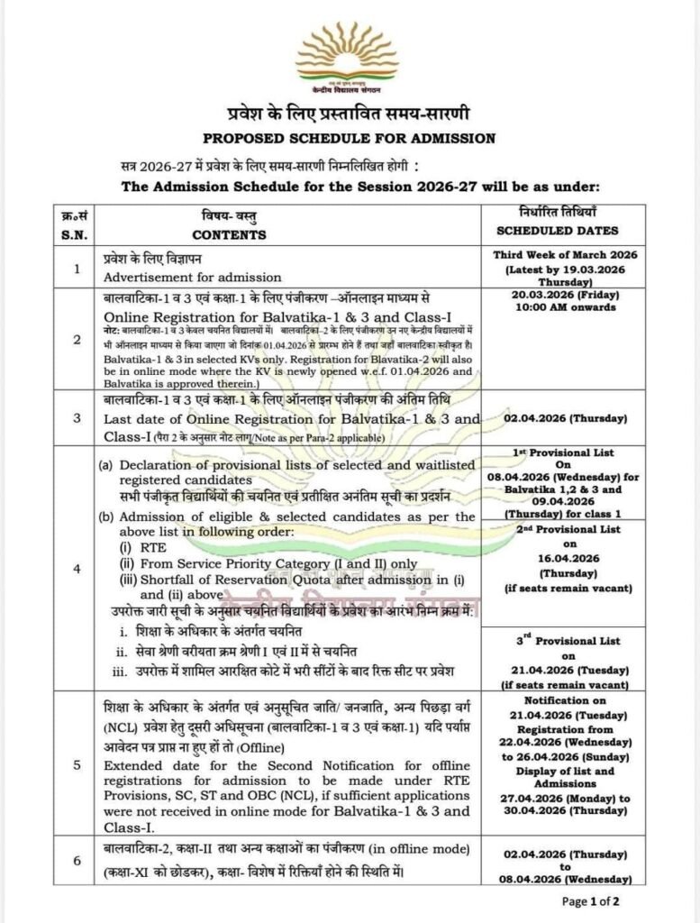 केंद्रीय विद्यालय संगठन (KVS) ने शैक्षणिक सत्र 2026-27 के लिए प्रवेश प्रक्रिया की समयसीमा जारी कर दी है। इसके साथ ही देशभर के लाखों अभिभावकों और विद्यार्थियों के लिए एक महत्वपूर्ण शैक्षणिक अवसर का द्वार खुल गया है। कक्षा 1 एवं बालवाटिका (1, 2, 3) में प्रवेश के लिए ऑनलाइन पंजीकरण 20 मार्च 2026 से प्रारंभ होगा।