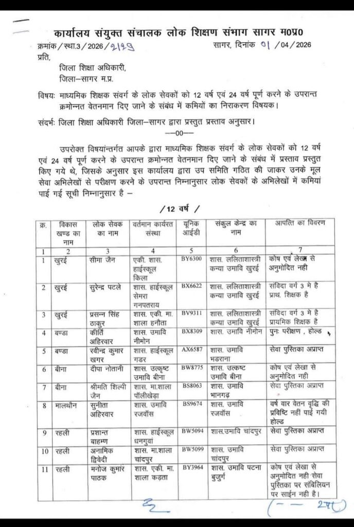 मध्यप्रदेश के सागर स्थित संयुक्त संचालक लोक शिक्षण संभाग सागर कार्यालय द्वारा माध्यमिक शिक्षक संवर्ग के लोक सेवकों से संबंधित एक महत्वपूर्ण प्रशासनिक पत्र जारी किया गया है। यह पत्र 01 अप्रैल 2026 को जारी किया गया, जिसमें 12 वर्ष एवं 24 वर्ष की सेवा पूर्ण करने के उपरांत क्रमोन्नत वेतनमान दिए जाने के प्रकरणों में पाई गई कमियों के निराकरण के संबंध में आवश्यक निर्देश प्रदान किए गए हैं।