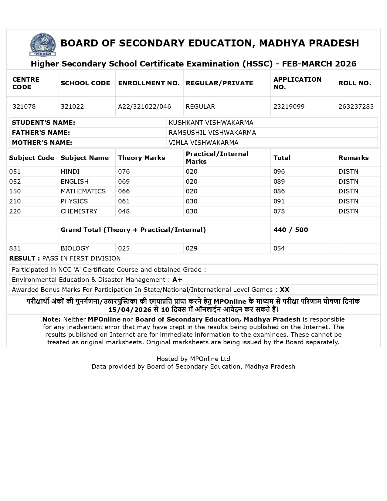 रीवा/भोपाल। Board of Secondary Education, Madhya Pradesh द्वारा आयोजित हायर सेकेंडरी स्कूल सर्टिफिकेट परीक्षा (HSSC) फरवरी-मार्च 2026 के परिणामों में रीवा जिले के एक साधारण एवं आर्थिक रूप से कमजोर परिवार से आने वाले छात्र कुशकांत विश्वकर्मा ने 500 में से 440 अंक प्राप्त कर प्रथम श्रेणी में सफलता हासिल की है। इस उपलब्धि ने यह सिद्ध कर दिया है कि कठिन परिस्थितियां भी दृढ़ इच्छाशक्ति और मेहनत के सामने छोटी पड़ जाती हैं। कुशकांत विश्वकर्मा का जीवन संघर्ष और परिश्रम की मिसाल है। सीमित संसाधनों के बीच रहते हुए उन्होंने अपनी पढ़ाई जारी रखी और अपने लक्ष्य को पाने के लिए लगातार प्रयास करते रहे। आर्थिक चुनौतियों के बावजूद उन्होंने अपने सपनों को टूटने नहीं दिया और अपने परिश्रम से सफलता की नई इबारत लिख दी।