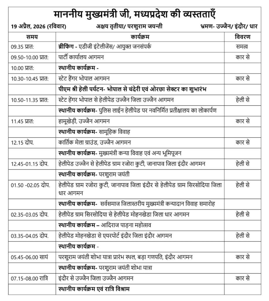 मध्यप्रदेश में 19 अप्रैल 2026 का दिन प्रशासनिक सक्रियता, जनसंपर्क और विकास कार्यों की दृष्टि से अत्यंत महत्वपूर्ण रहा, जब माननीय मुख्यमंत्री ने अपने निर्धारित कार्यक्रमों के तहत भोपाल, उज्जैन, इंदौर और धार जिले में विभिन्न कार्यक्रमों में भाग लिया। दिन की शुरुआत प्रातः 9:35 बजे भोपाल में ब्रीफिंग से हुई, जिसमें एडिशनल डीजी इंटेलिजेंस और जनसंपर्क आयुक्त के साथ प्रदेश की वर्तमान स्थिति, सुरक्षा व्यवस्था और जनकल्याणकारी योजनाओं की प्रगति पर चर्चा की गई। यह ब्रीफिंग मुख्यमंत्री के पूरे दिन के कार्यक्रमों की दिशा तय करने में महत्वपूर्ण रही, जिससे यह स्पष्ट हुआ कि शासन का फोकस विकास के साथ-साथ सुशासन और सुरक्षा पर भी समान रूप से है।