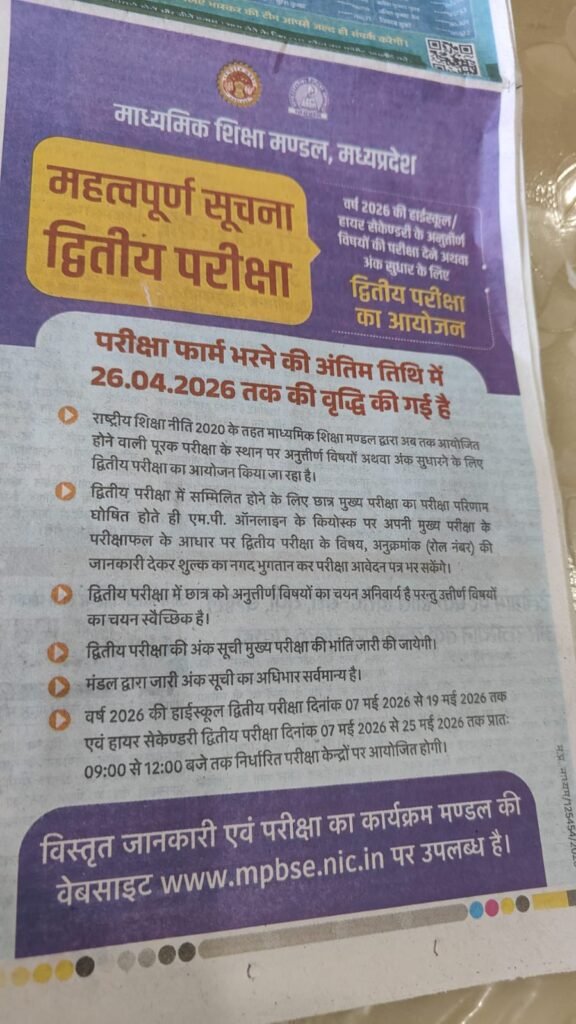 माध्यमिक शिक्षा मंडल मध्यप्रदेश द्वारा वर्ष 2026 की हाईस्कूल एवं हायर सेकेंडरी द्वितीय परीक्षा से संबंधित महत्वपूर्ण निर्णय लेते हुए आवेदन की अंतिम तिथि को 26 अप्रैल 2026 तक बढ़ा दिया गया है, जिससे उन हजारों विद्यार्थियों को राहत मिली है जो किसी कारणवश निर्धारित समय सीमा में आवेदन नहीं कर पाए थे या अपने परीक्षा परिणाम में सुधार की इच्छा रखते हैं, यह निर्णय न केवल विद्यार्थियों के हित में बल्कि नई शिक्षा नीति 2020 की भावना के अनुरूप भी माना जा रहा है, जिसमें छात्रों को अपनी शैक्षणिक प्रगति को बेहतर बनाने के लिए अनेक अवसर प्रदान करने की बात कही गई है, मंडल द्वारा जारी सूचना के अनुसार अब छात्र MPOnline पोर्टल के माध्यम से निर्धारित तिथि तक ऑनलाइन आवेदन कर सकते हैं, इस निर्णय के पीछे मुख्य उद्देश्य यह है कि कोई भी विद्यार्थी केवल एक परीक्षा के परिणाम के आधार पर अपने भविष्य से समझौता न करे बल्कि उसे अपने प्रदर्शन में सुधार का एक और अवसर मिले, वर्तमान समय में शिक्षा के क्षेत्र में प्रतिस्पर्धा लगातार बढ़ रही है और ऐसे में एक-एक अंक का महत्व बढ़ गया है, यही कारण है कि द्वितीय परीक्षा की व्यवस्था छात्रों के लिए वरदान साबित हो रही है, विशेष रूप से उन विद्यार्थियों के लिए जो किसी विषय में अनुत्तीर्ण हो गए थे या अपने प्राप्त अंकों से संतुष्ट नहीं थे, अब वे पुनः परीक्षा देकर बेहतर अंक प्राप्त कर सकते हैं, मंडल ने स्पष्ट किया है कि द्वितीय परीक्षा में शामिल होने के लिए छात्रों को मुख्य परीक्षा के परिणाम घोषित होने के बाद ही आवेदन करना होगा और उन्हें अपने रोल नंबर, विषय चयन तथा आवश्यक शुल्क का भुगतान ऑनलाइन करना होगा, इसके साथ ही यह भी बताया गया है कि अनुत्तीर्ण विषयों का चयन अनिवार्य होगा जबकि उत्तीर्ण विषयों में सुधार के लिए चयन वैकल्पिक रहेगा, इस व्यवस्था से छात्रों को अपनी कमजोरियों को पहचानने और उन्हें सुधारने का अवसर मिलेगा, द्वितीय परीक्षा का आयोजन मई माह में निर्धारित परीक्षा केंद्रों पर सुबह 9 बजे से दोपहर 12 बजे तक किया जाएगा, हाईस्कूल की परीक्षा 7 मई से 19 मई 2026 तक और हायर सेकेंडरी की परीक्षा 7 मई से 25 मई 2026 तक आयोजित होगी, परीक्षा का समय, प्रश्नपत्रों का स्तर और मूल्यांकन प्रक्रिया मुख्य परीक्षा के समान ही होगी ताकि परिणाम की गुणवत्ता और विश्वसनीयता बनी रहे, मंडल द्वारा जारी अंकसूची भी मुख्य परीक्षा की तरह ही मान्य होगी और उसका उपयोग आगे की पढ़ाई तथा प्रतियोगी परीक्षाओं में किया जा सकेगा, यह निर्णय छात्रों के आत्मविश्वास को बढ़ाने में भी महत्वपूर्ण भूमिका निभाएगा क्योंकि कई बार छात्र मानसिक दबाव, स्वास्थ्य समस्याओं या अन्य कारणों से परीक्षा में अच्छा प्रदर्शन नहीं कर पाते, ऐसे में द्वितीय परी