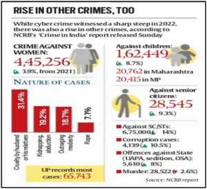• महिलाओं एवं बच्चों के खिलाफ अपराधों में भी वृद्धि देखी गई है। बच्चों के खिलाफ अपराध दर पिछले वर्ष की तुलना में बढ़कर 39.9 प्रति लाख तक पहुंच गई।