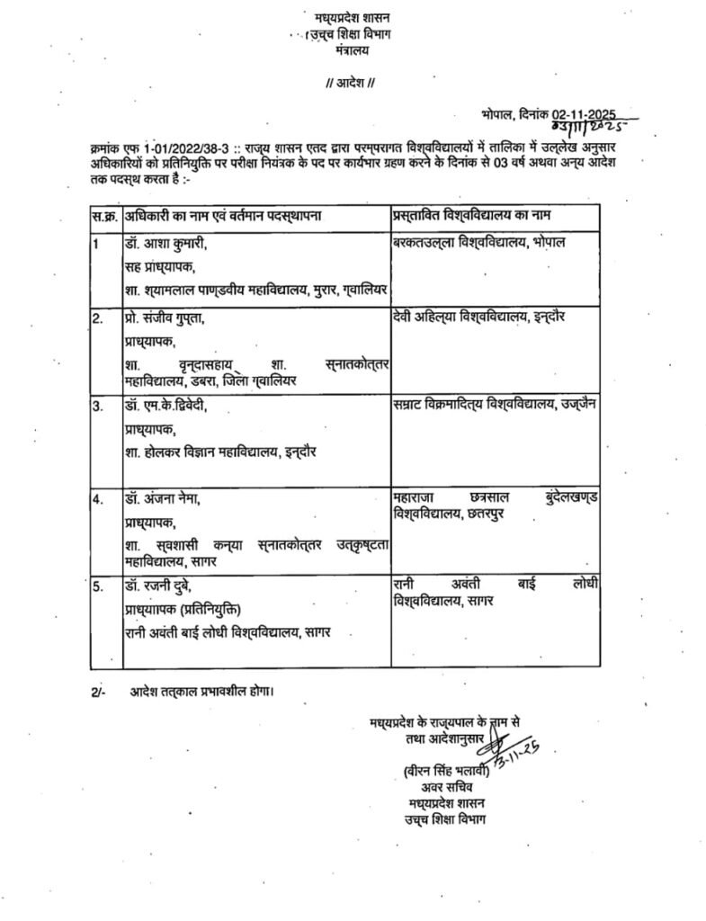 जारी आदेशों के तहत प्रदेश के परंपरागत विश्वविद्यालयों — जैसे बरकतउल्ला विश्वविद्यालय (भोपाल), रानी दुर्गावती विश्वविद्यालय (जबलपुर), अवधेश प्रताप सिंह विश्वविद्यालय (रीवा), विक्रम विश्वविद्यालय (उज्जैन), जीवाजी विश्वविद्यालय (ग्वालियर), हरिसिंह गौर विश्वविद्यालय (सागर) आदि में संबंधित अधिकारियों को परीक्षा नियंत्रक पद का कार्यभार सौंपा गया है।