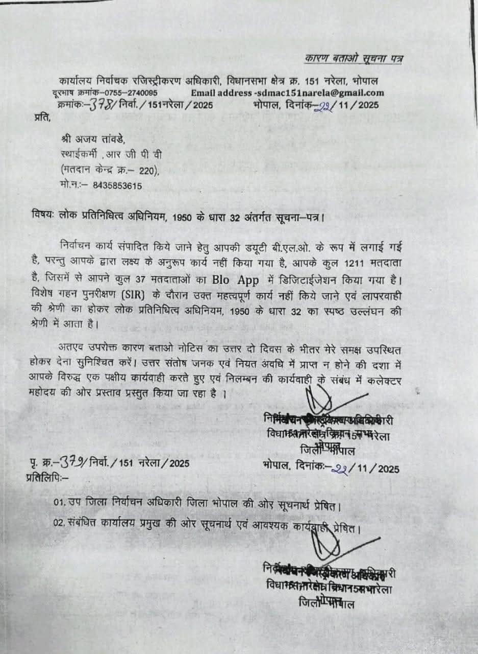 नरेला विधानसभा 151 में निर्वाचन कार्य में लापरवाही उजागर, कलेक्टर ने छह कर्मचारियों को जारी किया कारण-बताओ नोटिस