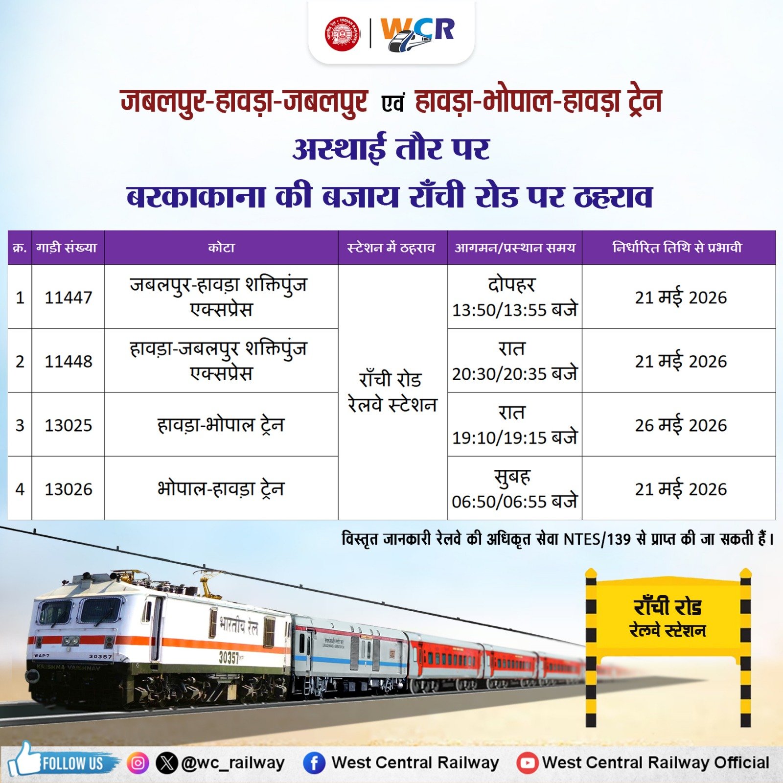 यात्रियों की सुविधा के मद्देनज़र रेलवे का बड़ा निर्णय, बरकाकाना की बजाय रांची रोड स्टेशन पर अस्थायी ठहराव की व्यवस्था लागू